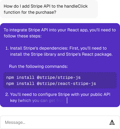 Let the AI help you code you, answer all your questions or refer you to specific files or docs. It's your personal coding buddy with a single click.